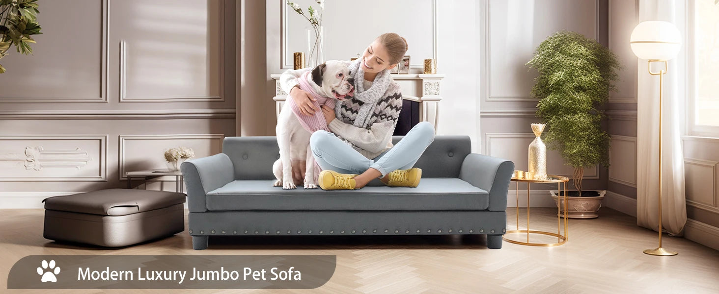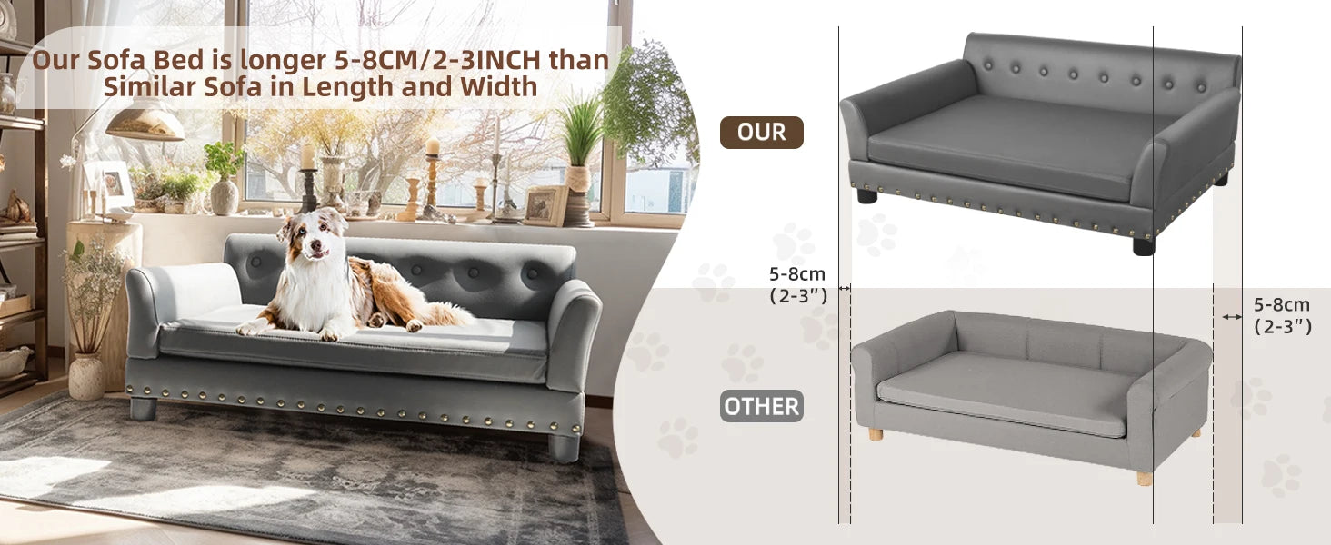 Bingopaw new innovative sofa-type dog bed, which is crafted from upscale microfiber silicone leather with nailhead accents, plus it comes with high-density sponge cushion, giving your dogs their own comfortable area to relax and sleep. The eucalyptus wood legs ensure maximum stability, great for large dogs or two medium-sized dogs