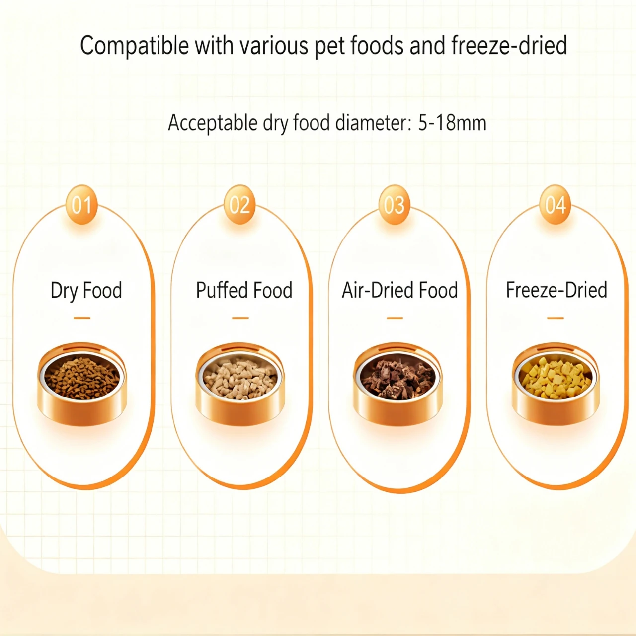 4. Compatible pet food: Dry pet food (recommended diameter: 3-18mm)